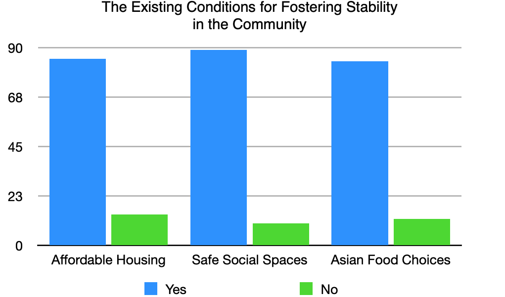 Our analysis of just under 770 surveys and focus group discussions with local residents highlights what make this neighborhood a sanctuary for residents, many of whom are of Chinese ancestry. The surveys reveal that 96 percent of the respondents are comfortable living in housing at facilities such as the Tenderloin Neighborhood Development Corporation. Eighty-three percent of survey respondents hailed Father Alfred E. Boeddeker Park located in the heart of the neighborhood as one of their primary gathering places. And 84 percent of the respondents buy their groceries in the neighborhood. Affordable housing, safe spaces in residential housing and in the park, and access to local produce are conditions that foster individual protection and family stability. See the graph below summarizing these community findings: